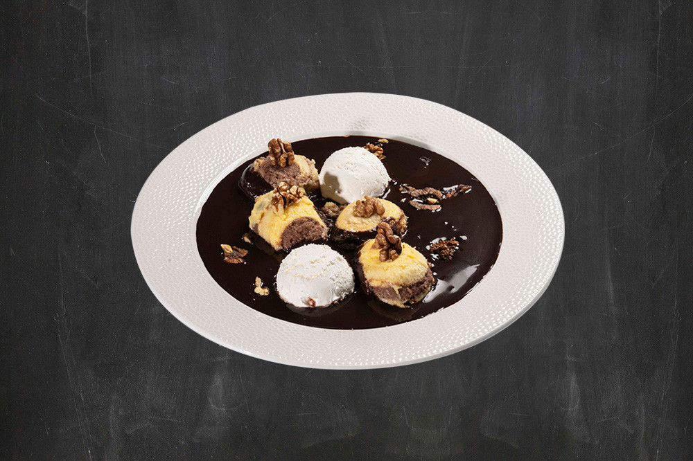 (piskóta, vaníliapuding, dió, tejszínhab, mazsola, rum, csokiöntet)